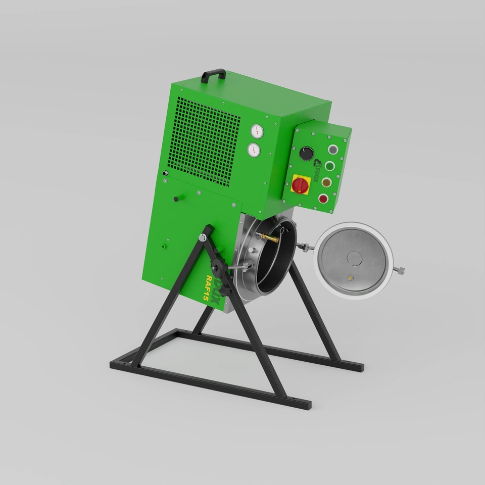 Destylator przemysłowy rozpuszczalnika RAF 15 skonstruowany jest z obudowy lakierowanej proszkowo wykonanej z blachy spawanej, zbiornika o pojemności roboczej 15 l oraz podstawy, która umożliwia jego przechył. Zbiornik i jego pokrywa powstały ze stali nierdzewnej INOX 304. Grzałka elektryczna umożliwia natomiast realizację procesu destylacji. Komfort obsługi urządzenia podnosi możliwość zastosowania worków do destylacji sprawiających, że operator nie wchodzi w kontakt z odpadem podestylacyjnym oraz nie ulega zabrudzeniu wnętrze zbiornika destylarki. Szlam również może być łatwo zlikwidowany, zgodnie z przepisami.